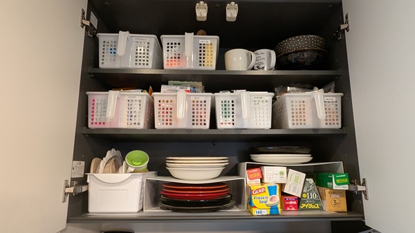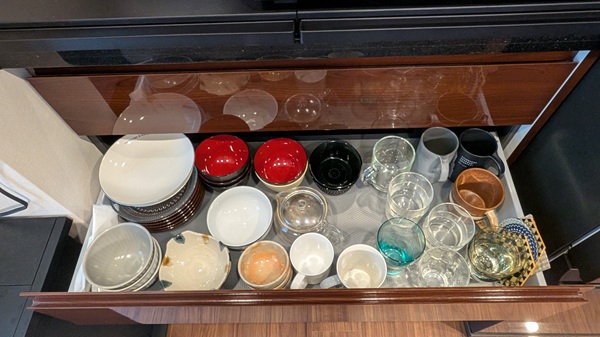 お皿が10枚以上重なっていたり、コップ類が高い吊戸棚に置かれていたりと、
