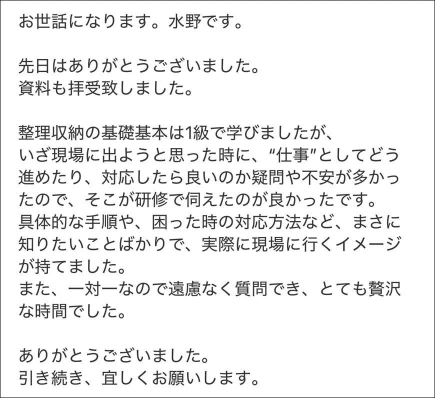 ホームセミナー情報【ご感想】整理収納アドバイザー向け座学研修 【ご感想】整理収納アドバイザー向け座学研修By Goodwaveスタッフ / 2026年2月10日 一都三県出張お片づけサービス株式会社Goodwave です。先日は「整理収納アドバイザー向け座学研修」のご参加ありがとうございました!整理収納アドバイザーの資格を取得したものの現場に出るまでの第一歩を踏み出すまで不安や心配もたくさんありますよねそんな方に金子アドバイザーが現場マニュアルや心得などをじっくりお伝えします。ファシリテイトの仕方、こんな時はどうしてる?!など、一級では習えなかったノウハウをたくさん聞くことができますよ✨何といっても「マンツーマン」なので気兼ねなく不安やお悩みに応えてもらえるのが嬉しいですね。これから現場で活動していきたい方のご参加お待ちしてます✨*掲載の承諾を頂いてご紹介いたします 研修のお申し込みはこちら 整理収納はあなたの人生を変える力を持っています♡幸せの波は、お片付けからやってきますよ!家が一番癒されるパワースポットにしませんか?お気軽になんでもお問い合わせください♡◆ 公式インスタグラムでは多数作業実例をご紹介! ◆ LINEのお友達追加でクーポンなどお得な情報配信中!
